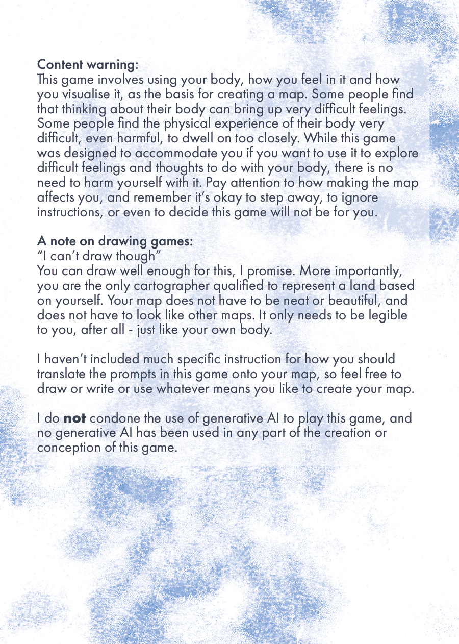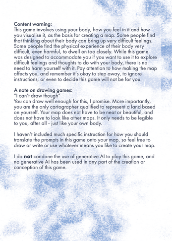 Please be aware that this is a game with introspective themes and requiring close attention to your body, so read the content warnings and play with care for yourself.